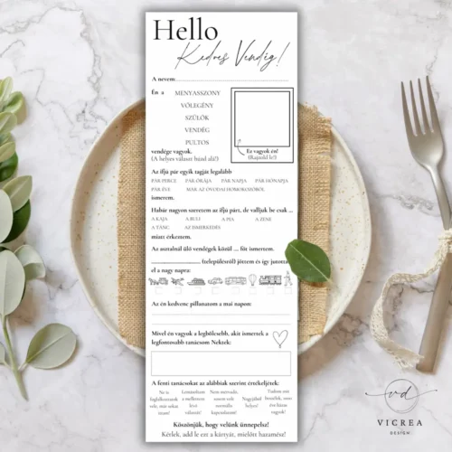 Esküvői vendégkártya – „Hello Kedves Vendég!” kitöltős játék – digitális, nyomtatható esküvői vendégkönyv alternatíva