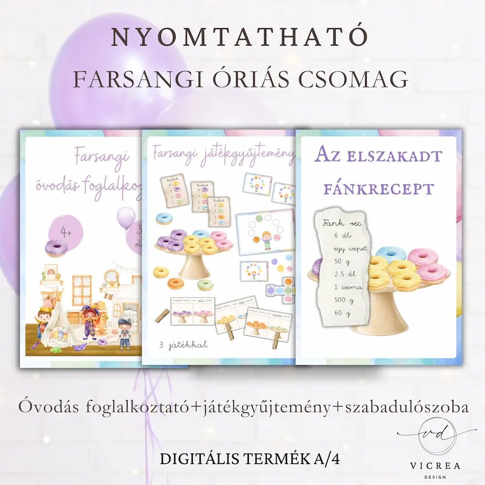 A Farsangi ÓRIÁS csomag egy letölthető, nyomtatható digitális anyag, amely három nagysikerű terméket egyesít: