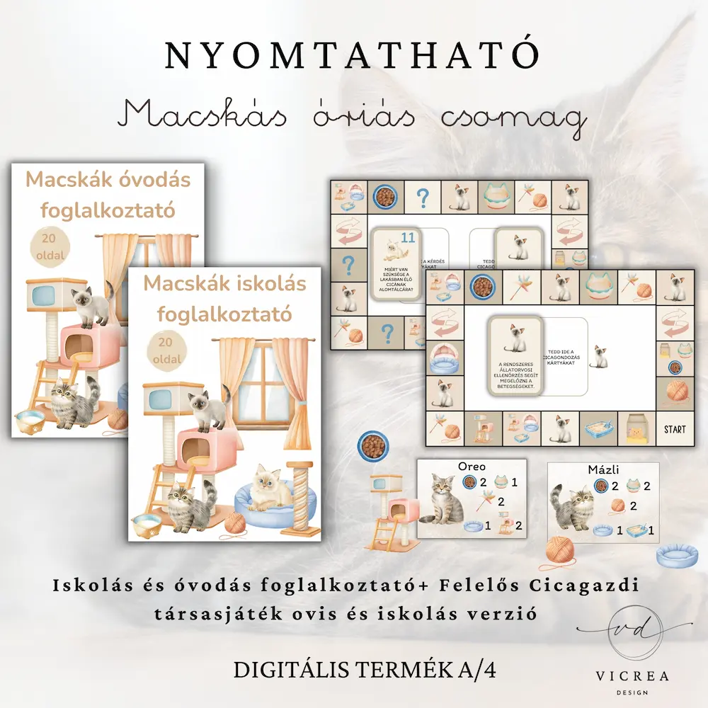 🐾 Macskás ÓRIÁS fejlesztő csomag – ovis és iskolás társasjáték + óvodás és iskolás foglalkoztatók (4–10 év)