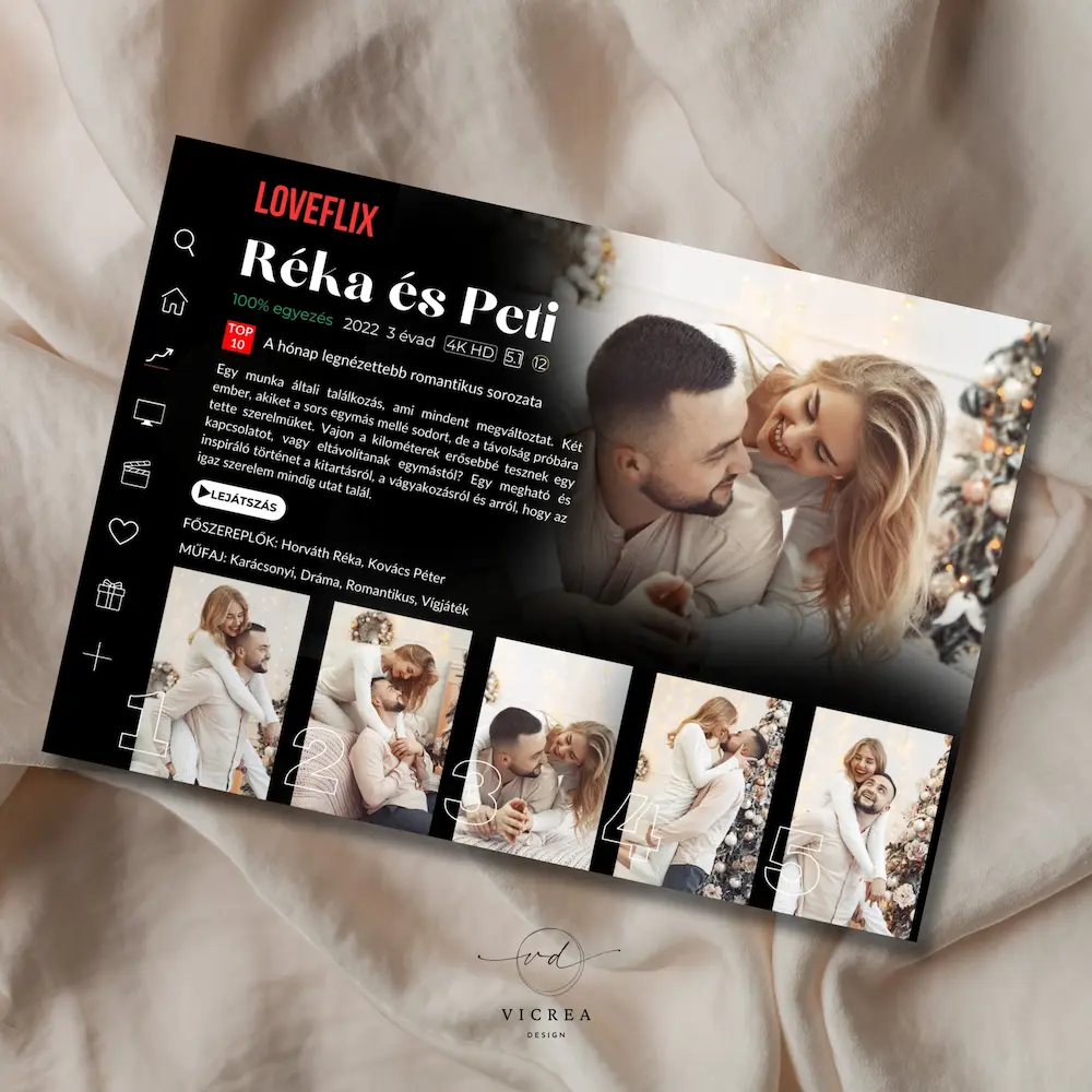 Lepd meg szeretteidet egy egyedi, Netflix stílusú karácsonyi poszterrel! Teljesen személyre szabható fotókkal, címekkel és leírással – tökéletes ajándék pároknak, családoknak és barátoknak. Digitális és nyomtatott verzióban is rendelhető.