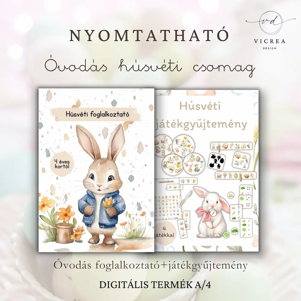 Nyomtatható Húsvéti játék- és foglalkoztató CSOMAG gyerekeknek – (40 oldalas óvodás foglalkoztató + 4 fejlesztő játék) (nyomtatható PDF)