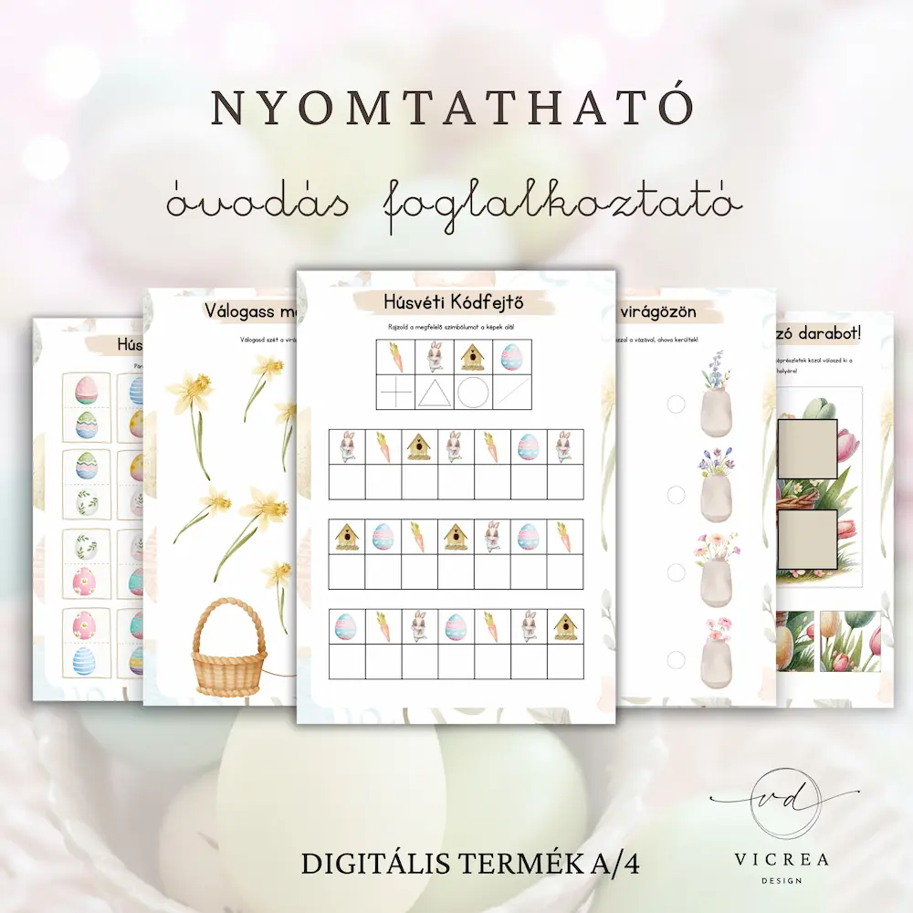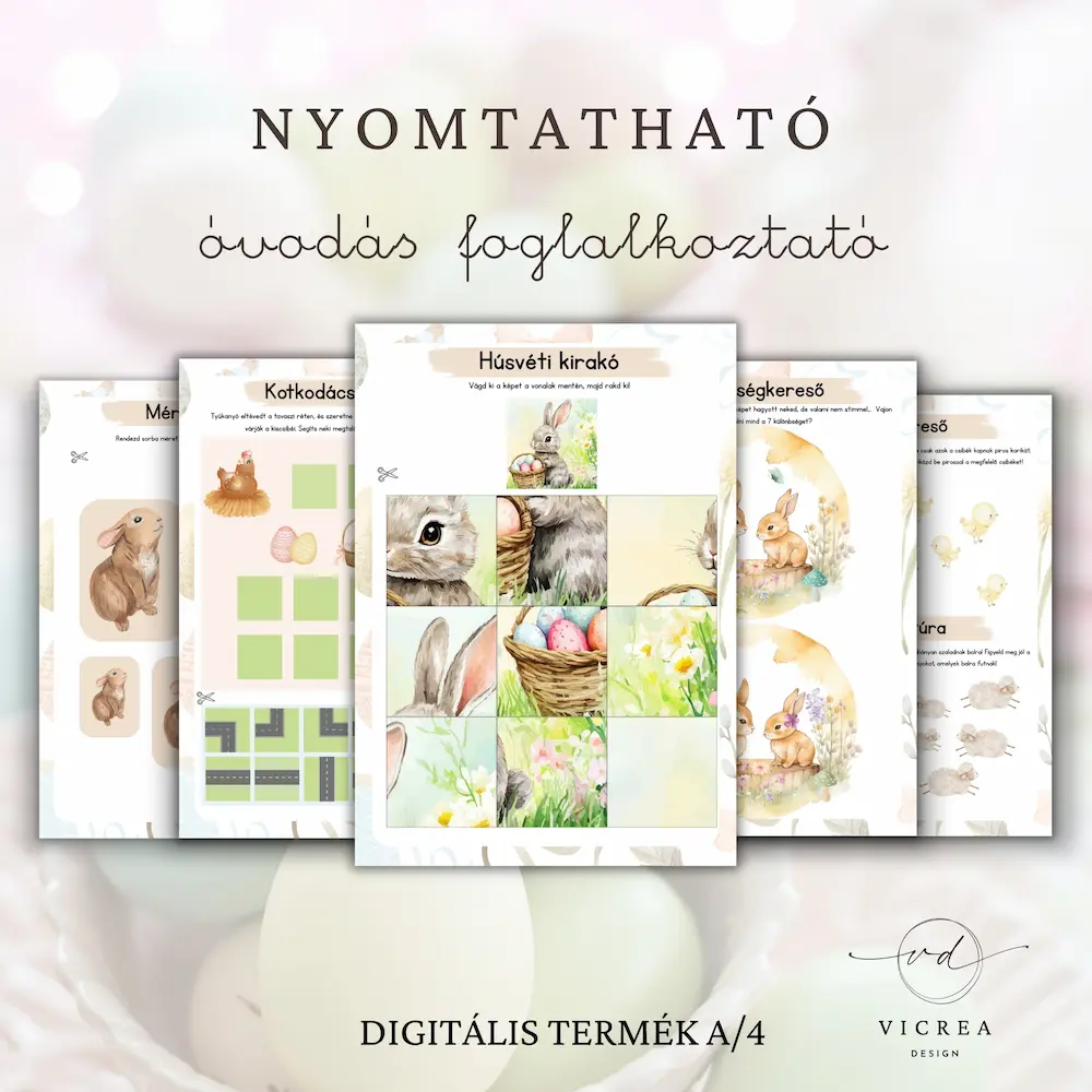 A kedves nyuszis és tavaszi illusztrációkkal készült feladatok tökéletesek otthoni játékhoz, óvodai foglalkozásokhoz, húsvéti tematikus napokhoz vagy fejlesztő foglalkozásokhoz.