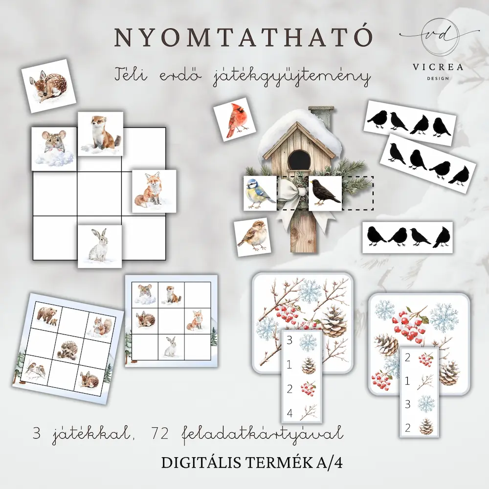 ✔️ Téli erdő játékgyűjtemény – 3 játék, 72 feladatkártya