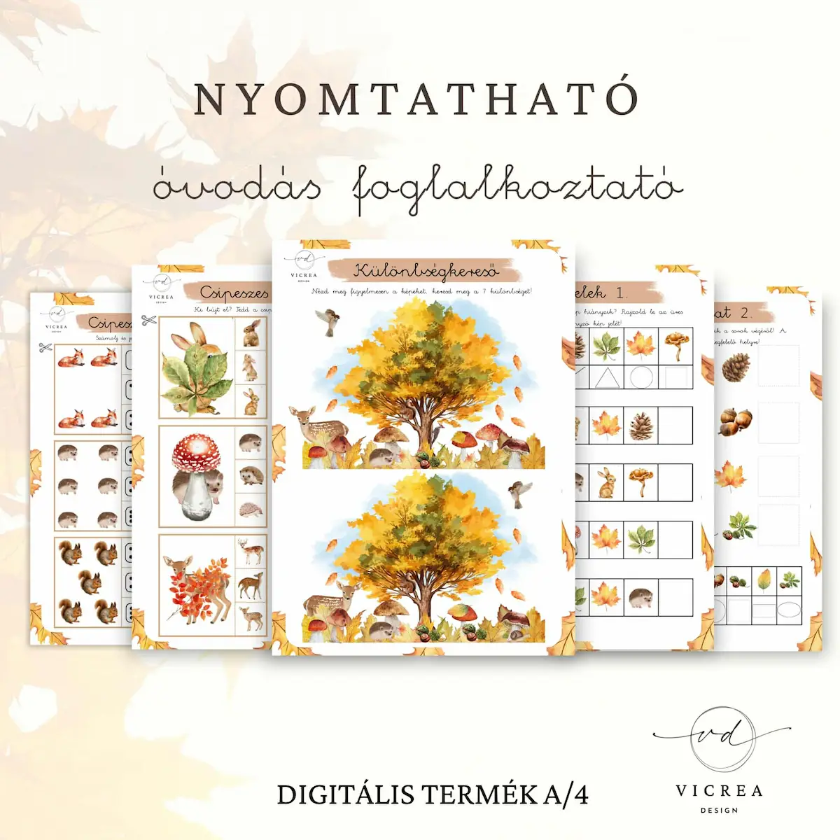 A nyomtatható őszi foglalkoztató csomag három teljes egységet tartalmaz – mindet 4–7 éves gyerekek számára tervezve, játékos, fejlesztő célokkal.