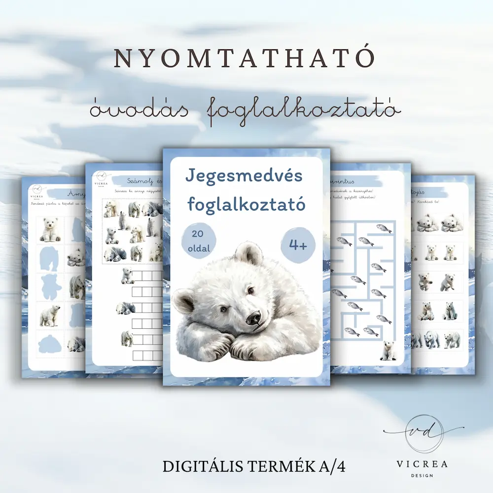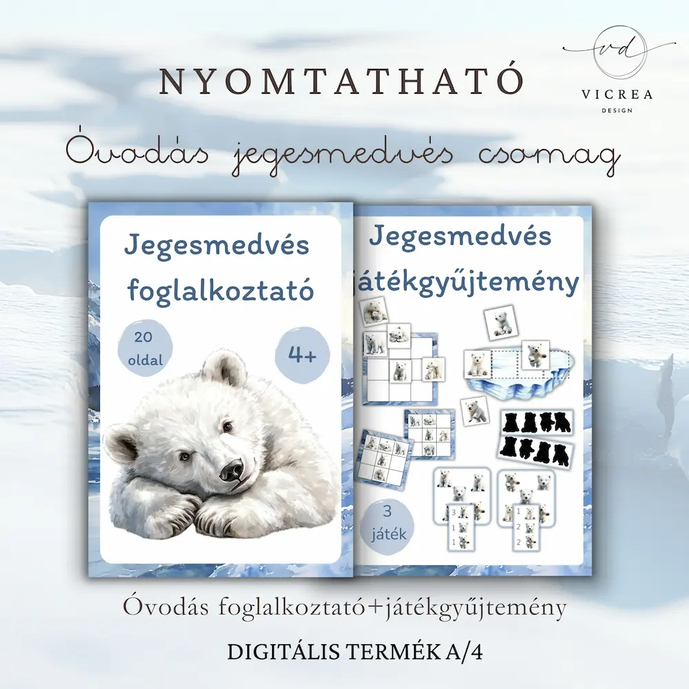 Óvodás jegesmedvés csomag – nyomtatható fejlesztő játékok és foglalkoztató PDF formátumban