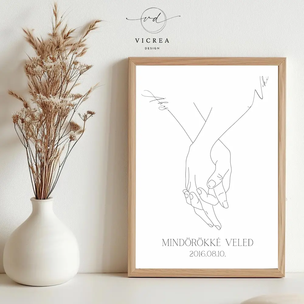 Ez a személyre szabott, minimalista páros falikép éppen ezt az érzést örökíti meg: két kéz, amely soha többé nem engedi el egymást.