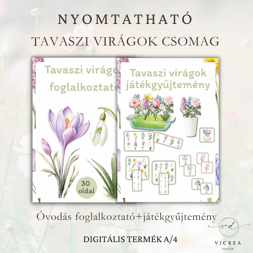 Tavaszi virágok csomag – nyomtatható óvodás foglalkoztató és fejlesztő játékgyűjtemény